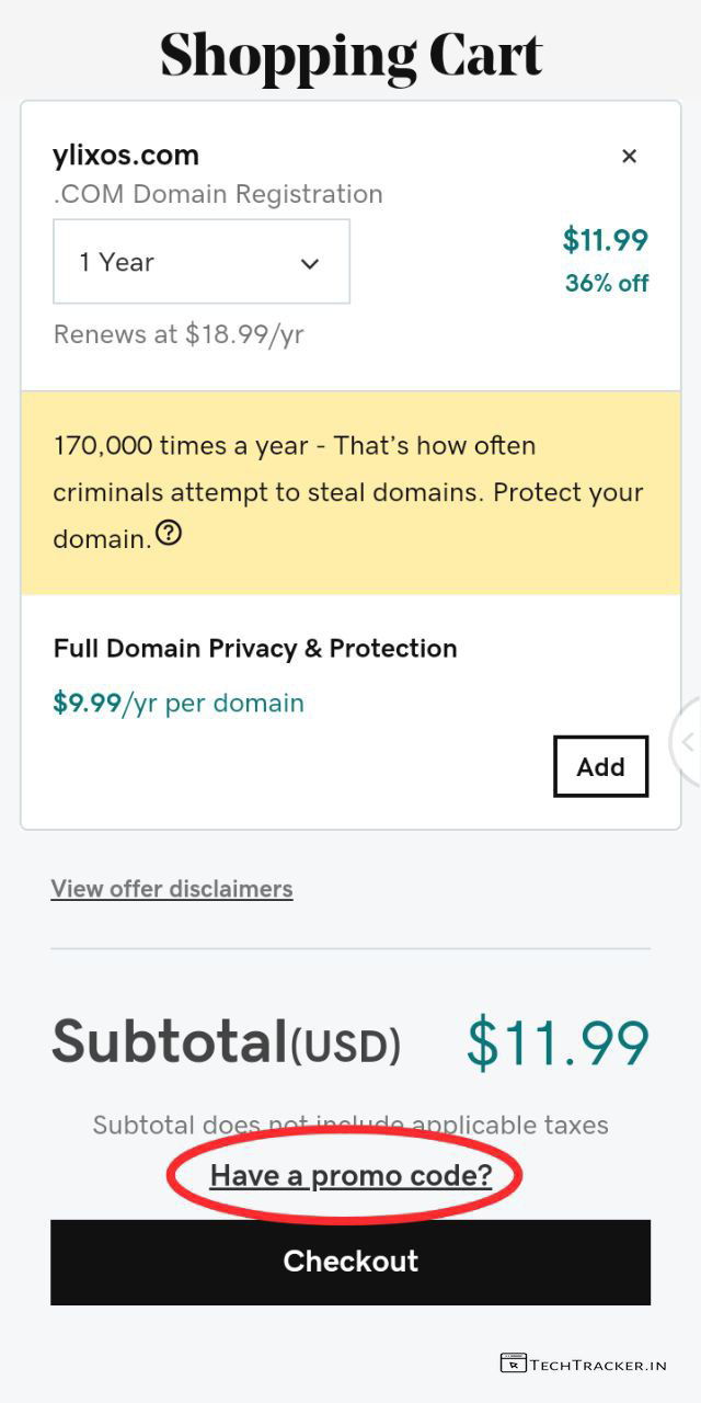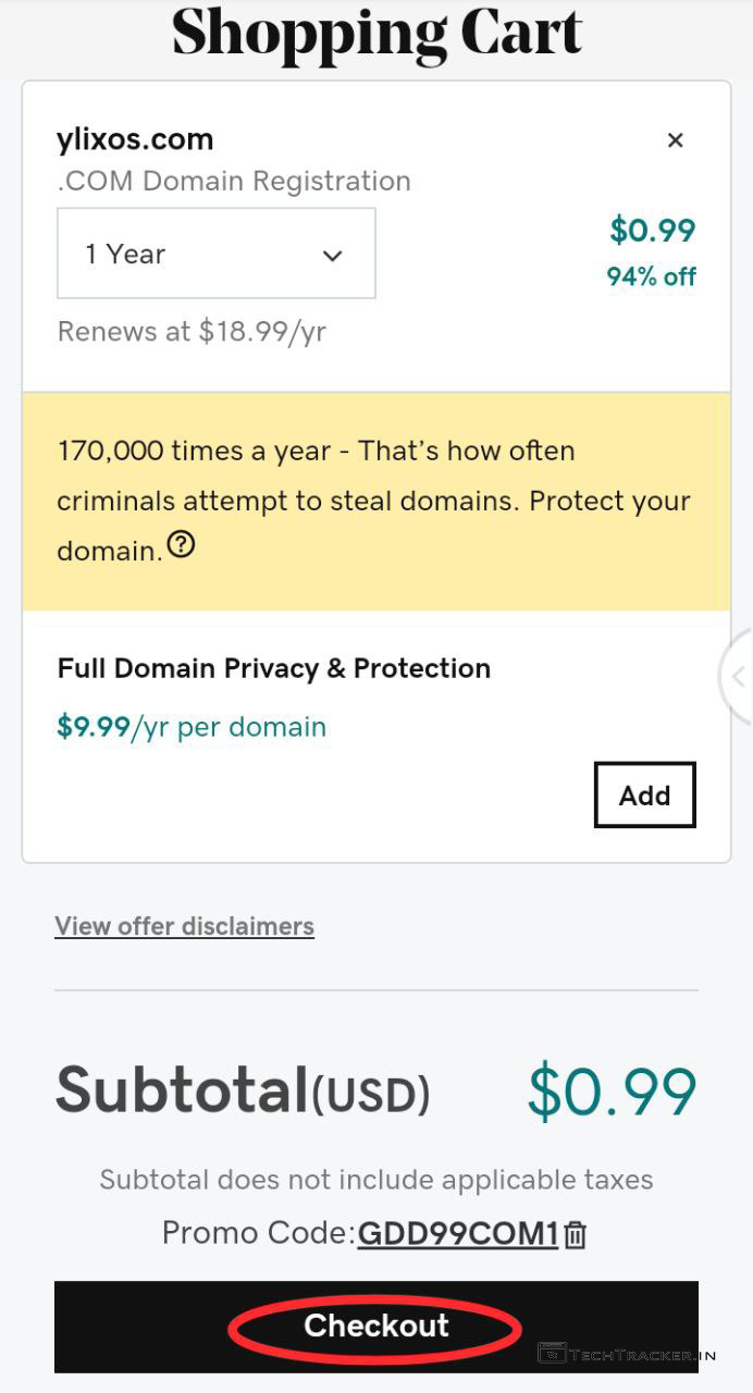 Complete the transaction of 1.34$ through card payment then you successfully purchased .com at 1$ for 1year with promocode on GoDaddy.com
