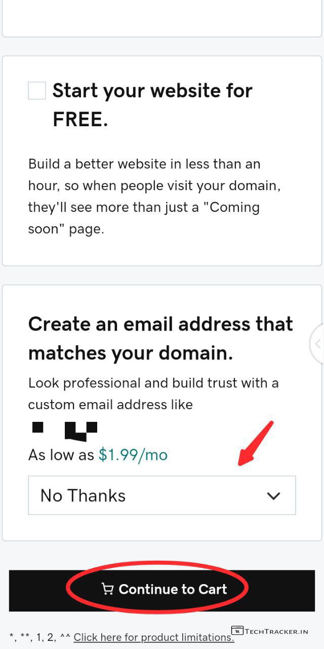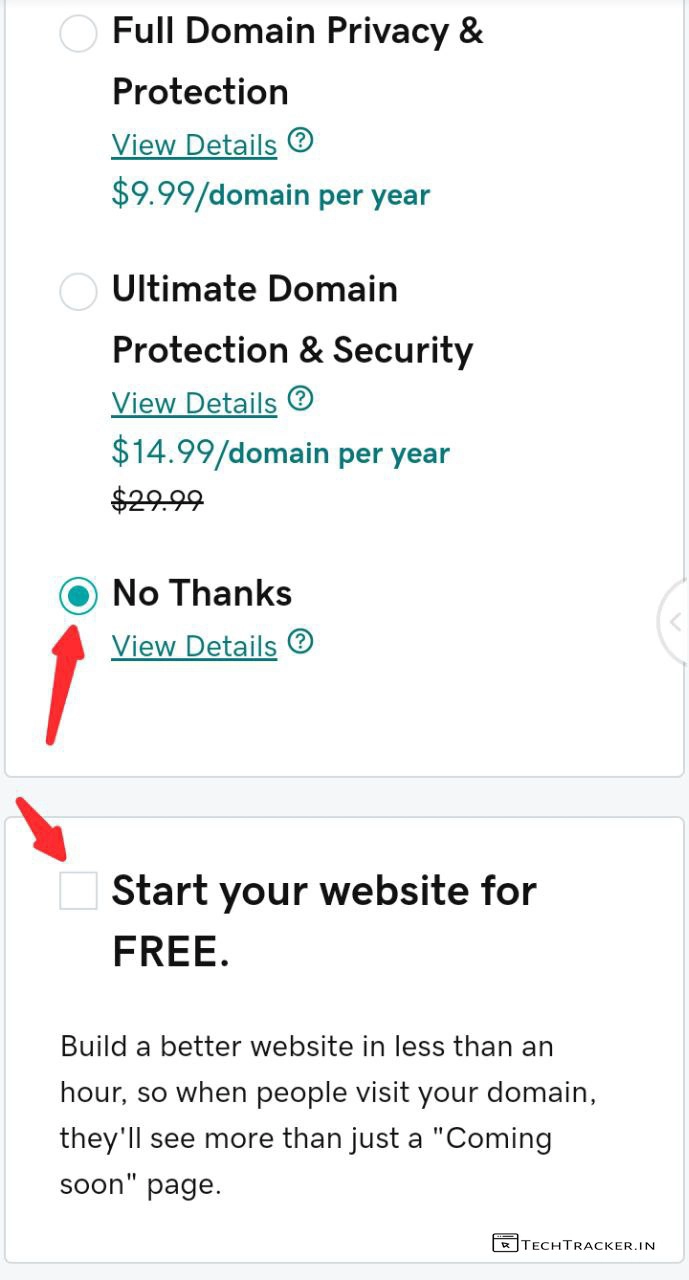 – Choose – No Thanks and Uncheck box of Start your website for FREE and scroll down.