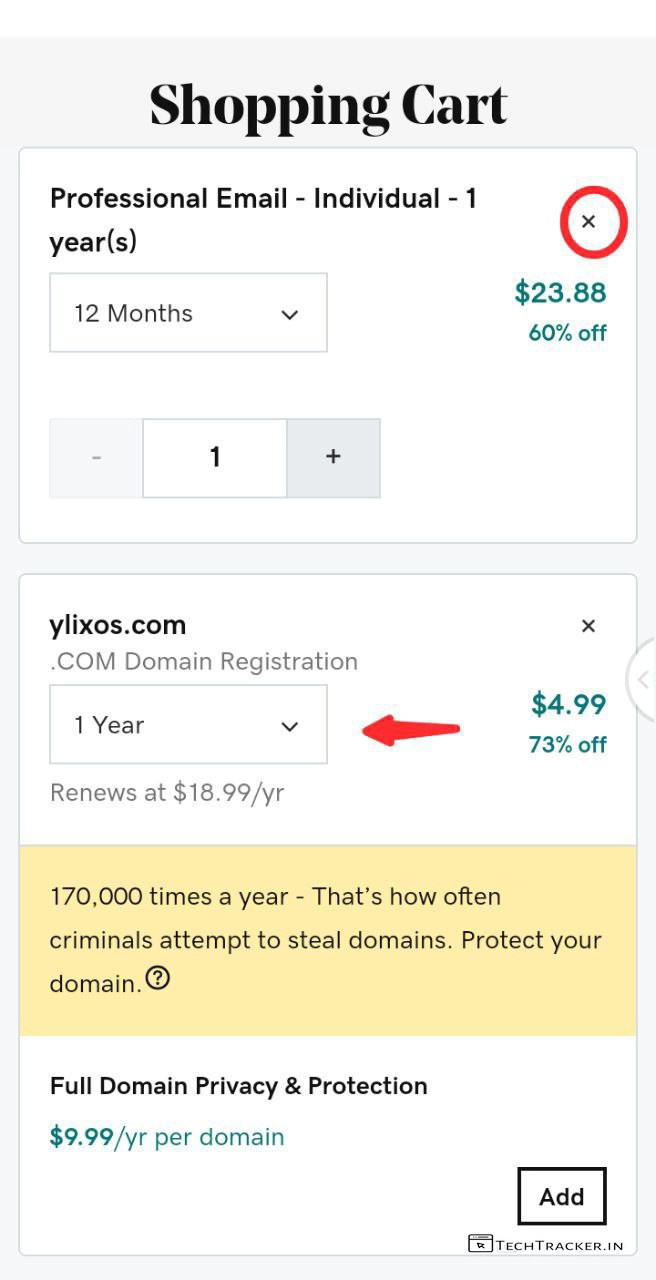 – Tap on × to remove professional email – individual – 1 year and choose domain for 1 year only and scroll down.
